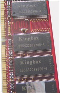 KingBox黑金刚DDR450内存条256MB采用单面16颗TSOP颗粒的设计,用料方面,内存采用了4ns的颗粒,理论上频率可以达到500MHz,但官方仅把频率定在450MHz的频率上,相信是为了更好保障用户系统最大的稳定性,也预留了一些超频的空间。