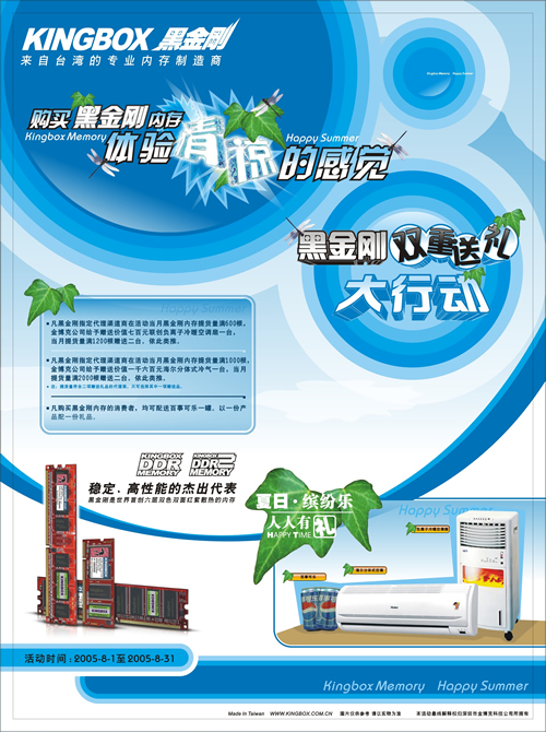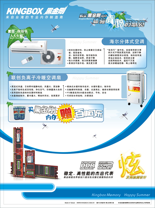 今夏以来,全国各地持续高温,最近由于台风登陆才使气温稍微下降,但台风一过气温马上又回升,酷热难挡。不过最近黑金刚Kingbox趁着暑期推出“购买黑金刚内存、体验清凉的感觉”的大型促销售活动。黑金刚此次活动不仅顾及消费者,还包括了经销商。在活动期间,消费者购买任何kingbox内存的消费者,都可以获赠百事可乐一罐,多买多送,让你冰凉之后一解暑气。而为了激励经销商,每个经销商在当月提黑金刚内存满600根,金博克公司给予赠送价值七百元联创负离子冷暖空调扇一台;满1200根赠送二台,多提多得。如当月黑金刚内存提货量满1000根,金博克公司给予赠送价值一千六百元海尔分体式冷气一台,同样多提多得。无论你是消费者还是经销商,在这样火热的夏天,如果想要可以真正地清凉一夏,那么赶快来加入黑金刚体验清凉的活动中来吧! 暑期活动的内容: