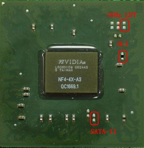 这款主板,使用的是最新A3版nForce4 4X MCP,从图上可以看出,七彩虹已经官方修改了芯片的SLI电阻,这也是为什么这款采用nForce4 4X主板支持SLI的原因。自从nForce4芯片电阻修改方法从网络上泄漏以来,NVIDIA就用APP树脂将关键电阻位封闭,防止用户修改。而七彩虹这款主板却去处了1GHz LDT和SATA-II电阻位的APP树脂,这样使我们将这款主板改造为标准的nForce4 SLI主板成为可能!