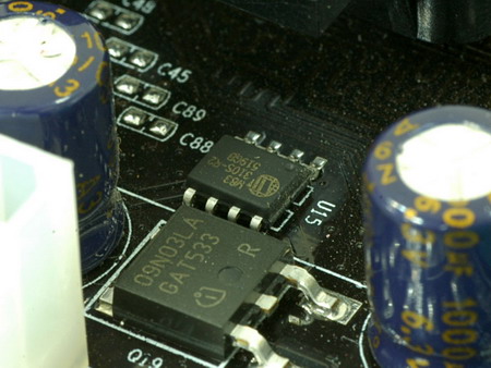 在内存供电部分,这款主板采用了Winbond 519GB PWM驱动芯片,想必热爱超频的玩家都知道Winbond生产的著名超频颗粒BH5吧?所以我们可以大胆推断,拥有Winbond驱动芯片的C.NF4X7-DS Pro内存超频能力也是相当强劲的。