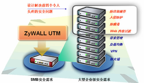 ZyWALL UTM除了具备常规安全网关的防火墙、VPN、负载均衡、带宽管理等功能外,又增加了目前网络安全产品难以解决的“防垃圾邮件、入侵检测防护、防病毒、web内容过滤”四大功能模块。八大功能整合于一台设备,最大程度的实现了高性价比。