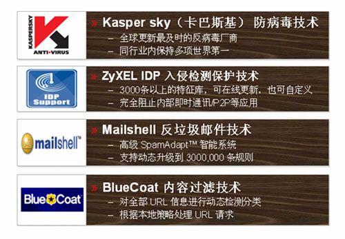 ZyWALL UTM新加入的四大安全功能均由相关行业内的世界著名厂商支持: