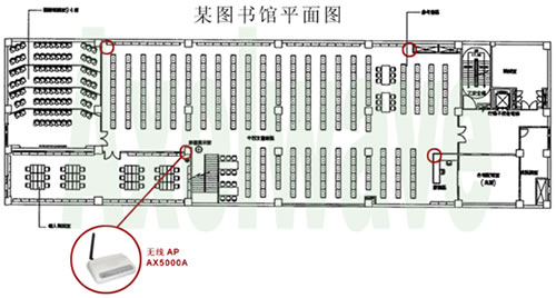 一般来讲,针对局部开发的室内大环境,如图书阅览室、礼堂、体育馆、大教室等,网络用户数量较多而集中,推荐设计以单个AP小面积覆盖,多个AP整合交叉覆盖形成大面积覆盖区域,每个AP都独立接到交换机上,保证有效带宽更宽。在具体实施项目中,我们采用Axelwave 兼容802.11b/g标准的室内无线Ap产品 AX5000A,完成无线网络的室内覆盖。