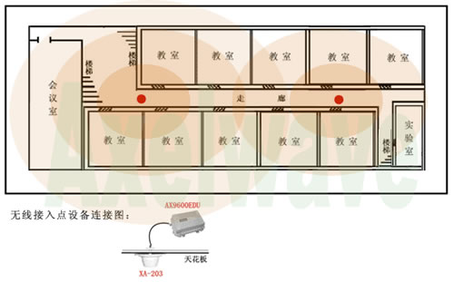 方案一,采用高灵敏度、穿透能力强的无线AP产品,配合分离式吸顶天线,以一个AP配合一个天线,或一个AP配合多个天线,完成室内区域的完全覆盖。在项目具体实施中,我们选用Axelwave高校专用AX9600EDU系列无线AP,配合XA-203室内吸顶天线,完成楼宇内部无线覆盖。采用分离式天线设计,可以适应无线设备与高增益天线的连接使用,以保障高质量的无线信号能够覆盖更远距离,同时增强设备在干扰较大的频率环境中使用的能力。