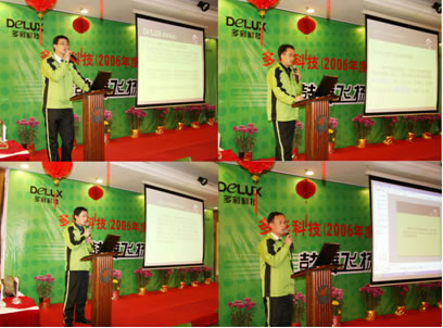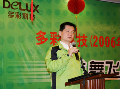 会议开始由多彩科技集团总裁夏炜先生进行了大会致词并对公司的发展远景进行了规划展望。夏炜先生指出2006年多彩公司将会以全新的面貌、全新的产品、更优质的服务与渠道伙伴们携手共创辉煌业绩。随后多彩四大事业部的负责人分别就各部门的工作情况进行了总结与回顾。数码事业部、机电事业部、键鼠事业部、音箱事业部的建立与日趋成熟标志着多彩科技日益丰富的产品规划和垂直深入的市场推广计划,以及更加清晰的渠道深耕政策。