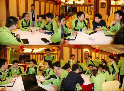 下午,市场推广部张勇先生对多彩整体市场推广计划进行了详细的讲解并对2006年工作计划进行了概述。随后,意气奋发的精英们共聚一堂交流经验,各代理商和分公司代表以及各事业部就工作中的相关问题进行了交流磋谈,整个会场气氛热烈高涨,群雄纷纷发表高见为公司的辉煌发展出谋划策……