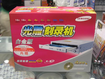 这次促销活动的刻录机是三星公司推出的首款具有光雕功能的刻录机,拥有顶极的刻录速度DVD+R、DVD-R达到了16倍速,DVD+RW达到了8倍速,还采用了金属光头结构,使运行更加地平稳,并拥有更长的使用寿命,很好的保护了消费者投资。