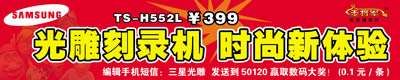 光雕刻录机不足400元?没错,从今天开始三星的新品光雕刻录机TS-H552L正式降价100元,以399元低价开始销售,并且三星还同步举办了“神雕行动 众侠寻宝”,凡购买三星光雕刻录机就有机会获得三星数码摄像机一台。