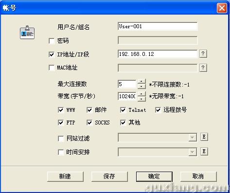 在服务器端的CCProxy主窗口中,点击“账号”按钮,弹出账号管理对话框,在属性栏的“允许范围”中选择“允许部分”,接着点击“新建”按钮,弹出账号对话框。接下来,限制IP地址为“192.168.0.12”的客户机的带宽。 在“IP地址/IP段”中输入该IP地址(图1),然后设置“最大连接数”,默认为“-1”,就是不进行任何限制,在此输入“5”,这样客户机只能和代理服务建立5个连接,也就可以限制BT下载时使用的线程数。接着在“带宽(字节/秒)”栏中为客户设置最大的网络带宽,如限制为100KB/s,则可输入“102400”,最后点击“确定”按钮。这样该客户机只能使用100KB/s的带宽,而且它和代理服务器最多只能建立5个连接。其它客户机的限制方法与此相同,不再赘述。