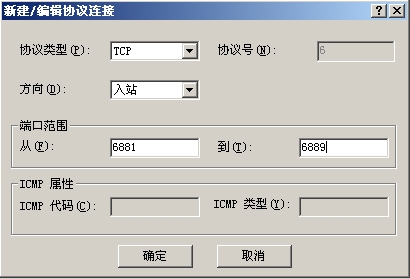 彻底封闭BT下载 解决BT对局域网的危害,最彻底的方法是不允许进行BT下载,BT一般使用TCP的6881~6889的端口。由于个人网络防火墙只能封闭本机的BT端口,对局域网用户无效,笔者就采用ISA2004封闭BT端口。 在ISA控制台窗口中,右键点击“防火墙策略”,选择“新建→访问规则”,弹出访问规则向导对话框,在“访问规则名称”栏中输入“禁用BT”,点击“下一步”按钮后,选择“拒绝”选项,接着在“协议”对话框中选择“所选的协议”。 点击“添加”按钮,在“添加协议”对话框中点击“新建→协议”,弹出协议定义向导对话框,在名称栏中输入“BT”,点击“下一步”按钮,进入“首要连接信息”对话框。点击“新建”,弹出“新建/编辑协议连接”对话框(图2),在“协议类型”中选择“TCP”,选择方向为“入站”,端口范围为“从6881到6889”,然后点击“确定”按钮,接下来一路点击“下一步”按钮,即可完成BT协议的定义。