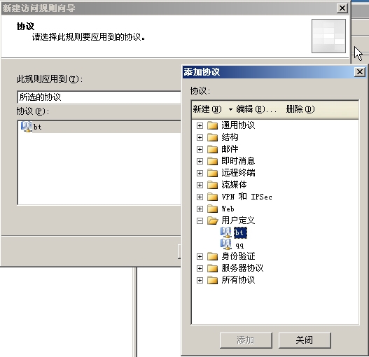 接着在添加协议对话框中展开“用户定义”,并添加BT协议(图3),点击“下一步”按钮后,指定访问规则源。点击“添加”按钮,弹出“添加网络实体”对话框,展开网络目录,选择“内部”。点击“添加”按钮,接着点击“下一步”按钮,设置访问规则目标,在网络实体对话框中展开网络目录,添加“外部”,然后进入“用户集”对话框,选择“所有用户”并点击“完成”按钮。