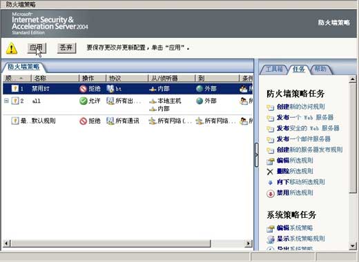 最后在防火墙策略窗口中选中这一规则,并点击上方的“应用”按钮(图4)。这样局域网内的用户就不能进行BT下载了。但该方法也有不足之处,如果BT软件使用的不是6881~6889的端口,该规则就会失效。由于BT端口是可改变的,所以一旦BT下载端口发生改变,你就得立即查到新的端口,并将它封掉。
