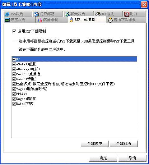 呵呵,上面是封堵BT的一般方法。如果你比较懒,或者计算机知识不足,或者作事情喜欢找更巧妙的方法,那就用聚生科技的Netsense网管系统,俗称聚生网管。如下图,选择全部控制,然后点击确定,就可以封堵当前几乎全部的P2P下载,确实厉害!呵呵!