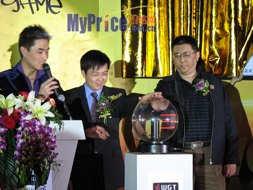 激动人心的启动仪式终于到来了,主持人倒计时,华硕中国的许佑嘉先生与新浪游戏频道的副主编,一起开启了华硕WGT2006的“时空魔法球“,这也标志着为期三个月的全国电子竞技盛筵正式开启。赛事覆盖沈阳,北京,上海,广州,成都,武汉,西安,重庆,南京,长沙,深圳,杭州等12所城市,以城市为单位进行地区选拔赛,优胜选手将于7月在北京中华世纪坛参加“华硕WGT2006”中国区总决赛。而获胜者将会与来自世界各地的其它赛区选手一同角逐世界冠军的至高殊荣。
