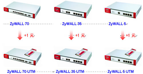 活动方案 从2006年6月1日起至6月30日止只要您购买以下ZyXEL ZyWALL系列中的任何一款防火墙产品只需要加一元钱就可以获得ZyXEL为您准备的超级大礼,让您的防火墙摇身变成UTM(统一威胁集中管理平台)。让您的网络固若金汤,从容应对各种网络问题,从此高枕无忧。