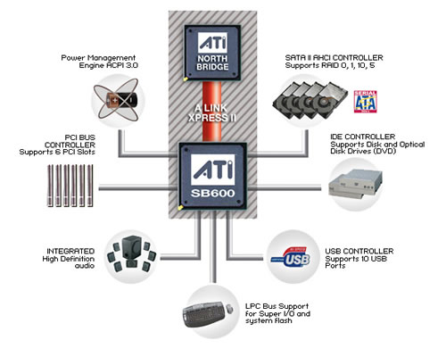SB600可不止这些特色功能,主板制造商们还可以根据自己的用户定位,来自行在SB600中自行添加相应的功能。如,可以添加两块Silicon Image 3132 SATA2磁盘控制器芯片来提供最多8个 SATA2 设备的支持。而nVIDIA的芯片组中现在最多还只支持6个。同时,nVIDIA 500家族的芯片组已经完全支持高清音频标准,不过这个功能ATI早已经支持。同时,nVIDIA nForce4却一直不能够支持高清音频标准,不得不说是一个遗憾。