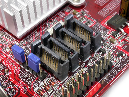 主板提供了四个SATA接口和4条内存扩展插槽,完全超出小板的范畴。南北桥皆使用被动式散热片,在安静的同时,温度还能够控制在40度上下。