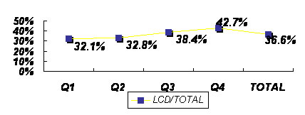 从显示器产品类型的销量来看,2005年CRT显示器销量实现负增长,Q2销量153.7万台,为全年最高,但这也成为CRT发展的分水岭;Q3 CRT销量开始下降,Q4更是跌至不足130万台。但LCD增长却颇为迅猛,由于正处于生命周期的成长期,LCD显示器增长具备两个特点,一是销量规模呈逐季度递增趋势,另外销量比重呈逐季度增长趋势。