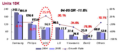 从各大品牌厂商市场整体增长率来看,AOC、飞利浦、优派市场占有率都明显上升;但三星、LG、明基占有率却开始下降,尽管分别经历了换帅风波,但是飞利浦、优派的增长也达到两位数,由于经营不佳和专注LCD等一些原因,LG、明基相比04年实现负增长。