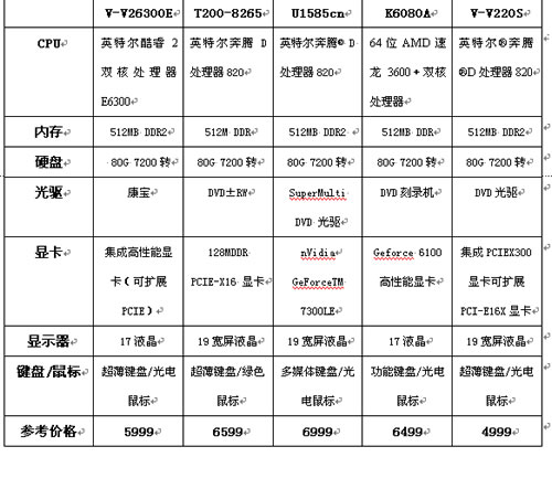 1. 长城嘉翔V-V26300E 参考价格:5999元 采用的Intel新一代64位双核处理器酷睿2 E6300,主频1.86GHz,512M DDRII内存;SATA80G-7200转硬盘;集成的ATI Radeon Xpress200 PCIE显示芯片,提供额外的PCIEx16插槽,可自由升级;COMBO光驱;8ms极速17寸长城液晶显示器,运用了长城独创技术,能够对显示颜色进行智能控制,具备更高的色彩还原和显示能力。预装正版XP操作系统。其他配件包括超薄键盘、光电鼠标、10-100M网卡、长城媒体中心、长城救护中心、杀毒软件等等。