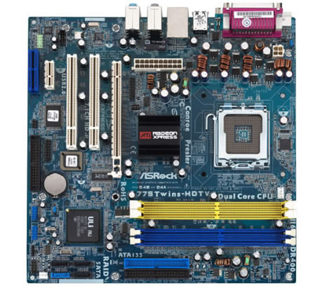 华擎775Twins-HDTV使用了整合主板一贯使用的MATX小板型设计,芯片组方面是ATI RC410 + ULI M1573的组合。基于英特尔LGA 775处理器接口设计,CPU供电部分使用了目前普遍应用的三相回路设计。ULI M1573南桥芯片为系统提供了4个SATA硬盘接口和8个USB 2.0接口,支持HDA高保真音频输出和NCQ技术。在磁盘设备的支持上,华擎775Twins-HDTV具备4个SATA(1.5 Gb/s)接口和2个PATA(支持4个IDE设备)接口,并可支持SATA的RAID 0/1、0+1以及JBOD。扩展部分,2个PCI插槽,1个PCIE 1x插槽,4个USB接口。Realtek PHY RTL8201CL 网卡芯片,10/100M自适应网卡,支持网络唤醒功能。Realtek ALC850 7.1声道 AC'97 声卡芯片,支持7.1声道音频输出。I/O部分提供了完整的7.1声道音频输出接口,不过没有提供任何视频输出接口。VGA和HDTV视频输出接口是通过附件中提供的扩展挡板实现的。