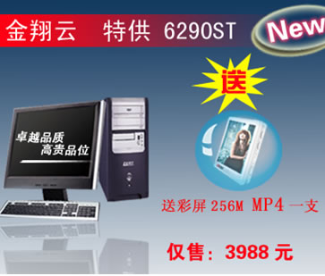 时逢双节,以做性价比最好的电脑为己任的金翔云电脑新推出的特供6290ST全面上市,做为家用兼高级商用的特供6290ST,用户还是很注重它的实用性以及配置各方面不显落后,就是所谓的性价比要高一些, 特供6290ST,无论其外观、配置、性能、价格,在各品牌台式机里非常具有优势及竞争力!而且购机还送价值299元的256M MP4一台,整机价格仅为3988元!