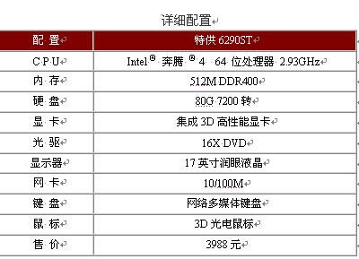 金翔云特供6290ST采用英特尔64位奔腾4处理器,2.93GHz主频,LGA775针,1M二级缓存,512MB DDR400内存,7200转 80GB硬盘,DVD光驱,集成3D高性能显卡(可扩独立显卡),17”润眼液晶显示器,网络多媒体键盘,3D光电鼠标,从整机配置来看,在多媒体、多任务处理方面性能强出色, 它配备了512MB容量的DDR400大容量内存,给程序的流畅运行提供了有效保障, 无论学习、工作、娱乐都能轻松应对,这款机器主要是针对中高端家庭娱乐用户,以及高级商务办公用户,整机高性价比的优势很明显,仅售3988元,并送价值299元的MP4一台!