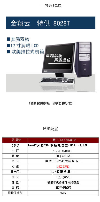 正因为双核处理器的显著优势,金翔云适时地推出了“双核+润眼”的新产品,金翔云所推出的特供8028T PC产品,就对这些流行元素进行了进一步升级。凭借简约典雅的外观设计,超低的价格,超高的配置,超人性化服务,再创行业双核新低, 无疑是将双核PC的价位拉到了冰点!其性价比之高无人能及。 金翔云特供刚刚推出的限量版特供机8028T,它采用英特尔奔腾D双核处理器 820 2.8G+17英寸润眼液晶以3999的价格低同类品牌1000元左右,真正的超高性价比!真正的物超所值!值得大家去考虑一下.