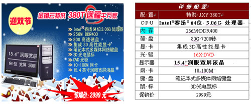 金翔云特供380T采用Intel赛扬64位3.06G处理器,256MB DDR400内存,16XDVD光驱,80GB 7200转高速硬盘,集成3D高性能显卡(可扩展独立显卡),配置15.4英寸宽屏润眼液晶显示器。特有的笔记本式多媒体网络键盘,3D光电鼠标, 现在液晶风暴席卷了整个台式品牌电脑市场,让更多的消费者体验到了液晶的精彩所在。非常值得一提的是它的15.4英寸的润眼宽屏显示器。从整体配置来看它在进行多任务处理及办公使用上都是得心应手,游刃有余。