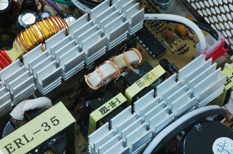 电源内部功率管散热片采用Y型开槽,多鳍片设计,这种设计能够最大限度的增加散热片与空气的接触面积,(平均接触面积较普通散热片提高近40%!)迅速带走功率管工作时产生的温度。