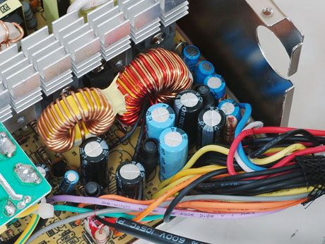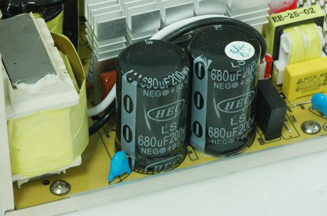核动力530PQ白金版,额定功率300W电源,是因为采用了两颗高耐压680uF的滤波电容,同时增强+5VSB以及12V输出,12V输出达18A,满足Vista认证显卡跟CPU的高需求。