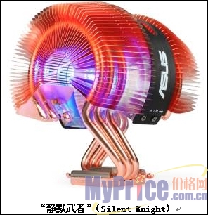 华硕当家花旦Silent Knight 100%全铜制造,只有0.2毫米的散热鳍片,相对同类产品减轻了30~50%的重量,同时有效减小风阻,最大程度地提高单位重量的散热能力。6根热导管采用创新的“8”字形设计,能高效的将底片的热量迅速传至鳍片。其搭配的VRM导风罩,集中风流导向CPU周围的电路模块,增进风量,降低温度,提升系统稳定度以及主机板的工作寿命。