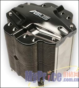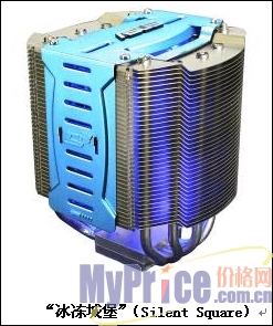 同样9厘米静音风扇内置的Silent Square采用热管散热加双面波形散热鳍片的技术,波形散热鳍片设计增大了15%的热交换区域,5条热管从底部直接贯穿到散热鳍片顶部。VRM (电压调节组件)过热保护功能,在为处理器散热的同时,顺势带走CPU插槽周边北桥芯片以及主板供电模块的热量,保护周边电子元件。 Inner Fan 设计的风扇会依据CPU的温度自动调节转速,即使在160W的功率下,Silent Square却有18分贝的极致静音表现。