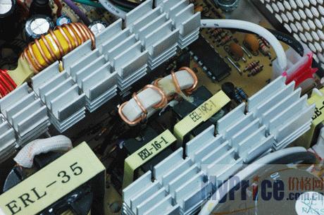 电源内部功率管散热片采用Y型开槽,多鳍片设计,这种设计能够最大限度的增加散热片与空气的接触面积,(平均接触面积较普通散热片提高近40%!)迅速带走功率管工作时产生的温度。