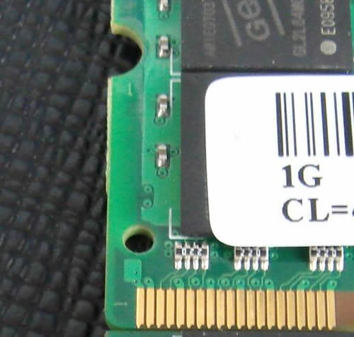 首先看有内存CAS参数的正面,左侧PCB板边缘,半圆形内凹的正下面,用肉眼就可以看清楚的数字“1”,而它下面的“2”由于在不同层面上,比较难识别。看到这里,您可能还有点摸不找头脑,我们接下来看内存的背面
