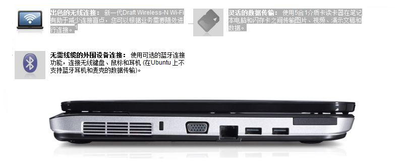 | 连接技术: | 网络接口(RJ45), RJ11, 1394, VGA, 4个USB 2.0, 交流电源适配器接口, 耳机插孔, 麦克风插孔, 音频插孔, 5合1读卡器, 34毫米ExpressCard插槽 |