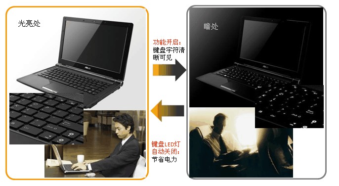 -在光亮处,键盘LED灯将关闭,并锁住此功能,键盘LED灯会避免意外开启,可节省电力,延长电池使用时间。