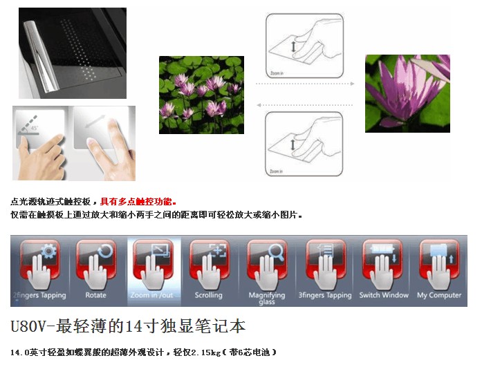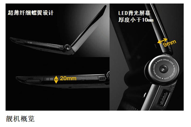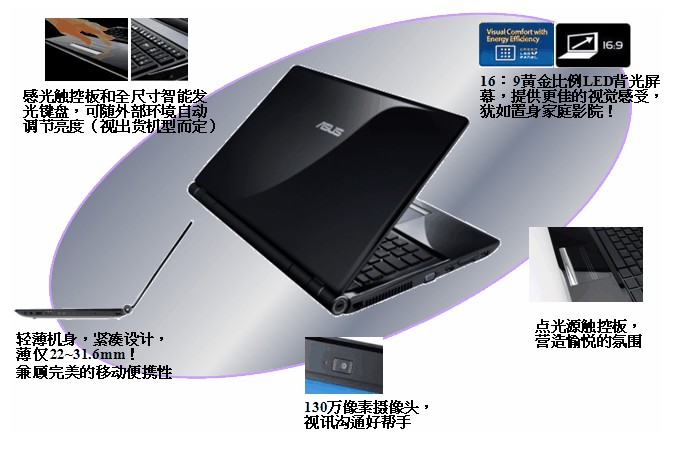 华硕U80配备英特尔® 酷睿™2 双核处理器,14.0英寸轻盈如蝶翼般的超薄外观设计,拥有家庭影院最佳播放的16:9?金比例屏幕及ATI Mobility Radeon™ HD4570的独立显示芯片,为您创造最精彩、舒适的影音盛宴。另外,它最高可支持4GB的内存(需操作系统支持)以及高达500GB的硬盘存储空间,包括802.11a/b/g/n 无线联机能力,用户可以尽情享受移动计算体验。Bluetooth® 2.1 + EDR便于扩展。点光源轨迹式触控板支持多点触控功能,可以直接浏览网页、文档等,甚至可以用手指来轻松地缩小和放大照片。