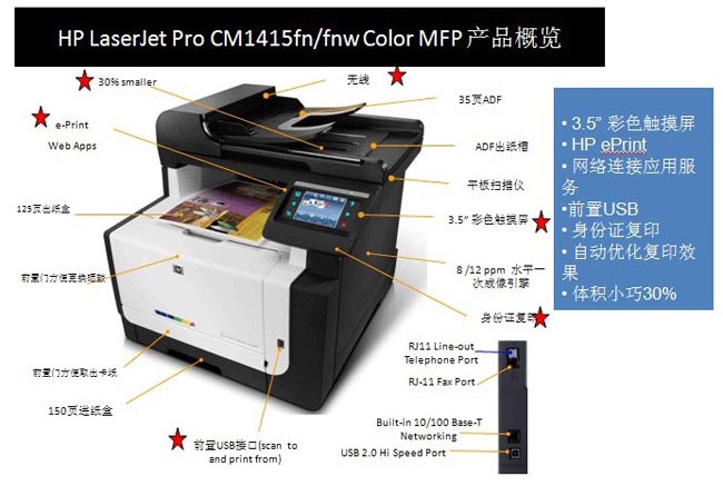 型号:LaserJet Pro CM1415fn 彩色多功能激光一体机 (打印 复印 扫描 传真)