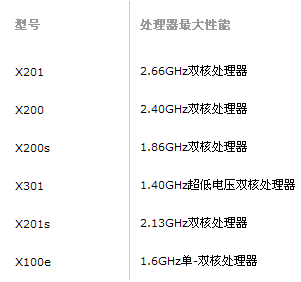 让工作更有成效 极致便携ThinkPad® X系列笔记本电脑非常便携,大部分X系列笔记本电脑的重量都在1.36公斤以下,新产品ThinkPad X201/X201s最轻只有1.12公斤! 节省空间X系列笔记本电脑的最小尺寸仅有295×210毫米,可以轻易地放置于拥挤的桌面和飞机座椅桌板上 全天候工作工作时间更长。ThinkPad X201s笔记本电脑一次充电可以连续工作12.3小时! 宽屏幕X301笔记本电脑最高可以配备13.3?宽屏。其LED 背光显示屏也有助于缓解眼部疲劳。 强大网络连接X系列笔记本电脑几乎提供了目前所有的连接选项。为了获得最佳的无线接收效果,上盖侧边为高强度无干扰玻璃纤维,其他部分则使用坚固的碳纤维。您在不同工作地点之间移动时,可以通过Access Connections™ 自动完成网络切换。 ThinkPad X201和X201s — 便携、耐用、快速、安全使用ThinkPad X201和X201s笔记本电脑,您可以无拘无束地工作。 主要特点: • 最新英特尔®处理器 • Genuine正版Windows® 7 操作系统 • 长达12.3小时的电池续航时间 • 多种连接选项 • 最小重量仅1.12公斤 • 业界领先的指纹识别器(可选) • 全尺寸防泼溅键盘 • 硬件密码 • APS硬盘保护系统 超长电池使用时间在您外出时,笔记本电脑必须拥有优异的电池效能才会实现不间断的工作。 X系列笔记本电脑结合联想电源管理特性、精心挑选的低电压处理器、低能耗显示器以及最新电池技术,可以提供长达13.2小时*的电池使用时间。而且联想电池延时技术允许您在极端情况下暂时延长电池使用时间。 以更快的速度完成更多工作我们最新的X系列超便携笔记本电脑速度更快,您可以将有限的时间用于真正重要的事务。 • 最新的带有智能加速技术和超线程技术的英特尔®酷睿™ i处理器(X201和X201s)可以加快开机、关机和应用程序加载速度 • Windows 7® 联想增强体验版系统下实现20秒开机、5秒关机 • 通过业界领先的ThinkPad指纹识别器(可选)实现快速登录和身份验证 ThinkPad X100e — 最经济实惠的 ThinkPad笔记本电脑 ThinkPad品质,大胆的新设计。高便携性,易于使用和专业级别。是最好的吗?令人惊讶的低价格!基本商务工作的最佳选择。 主要特点: • 颜色醒目:光滑饰面的午夜黑、北极白与热力红 • 全尺寸防泼溅键盘,继承ThinkPad传统,设计更加现代 • 体积小、重量轻、11.6” 高清显示器 • 价格实惠同时具有各种良好的品质保证 • 两种操作选项:经典的小红帽® 和易用的多点触控触摸板 • 新的高感光网络摄像头 • 多种连接选项 • 企业级操作系统 超级环保 • 获得EPEAT金牌认证(X301,X201,X201s和X200s指定机型)和EPEAT银牌认证(X200) • 通过能源之星® 认证 • 符合RoHS标准 • 符合欧盟旨在减少有害物质的标准 • 节能型低电压处理器、LED背光显示器和固态硬盘 • 无砷玻璃和无汞显示器 • 90%的包装(按重量计)可以回收