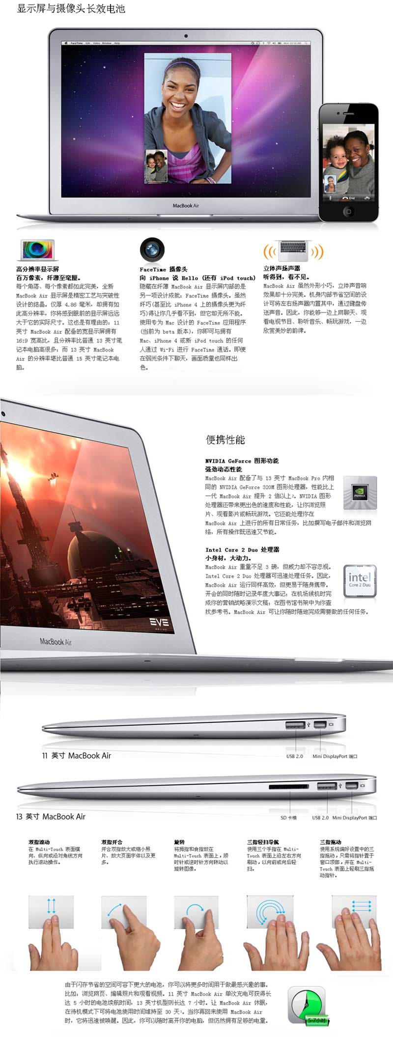 要实现真正的便携,无线功能必不可少。这就是 MacBook Air 拥有 802.11n Wi-Fi 和蓝牙 2.1 + EDR 的原因所在。无线连接可让你浏览网页、发送电子邮件和打印文件3。还可让你下载音乐、视频和应用程序(该功能即将在 Mac App Store中提供)。无论你身在何处,MacBook Air 都能让你保持网络连接。两个 USB 2.0 端口、一个 SD 卡插槽 (13 英寸机型) 和耳机插口为你提供众多选择。如果你想在桌面上获得更宽阔的视觉效果,可将 Mini DisplayPort 连接至 27 英寸 Apple LED Cinema Display 显示器、投影仪或 HDTV。