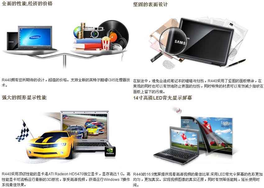 强劲、时尚和诱人的价位,三星R440笔记本电脑应用最新的英特尔处理器技术,使你获得最新最酷眩的游戏视频体验。出众的设计,方便的应用,顶级的性能,合理的定位,体验最新的应用不再是梦想。
