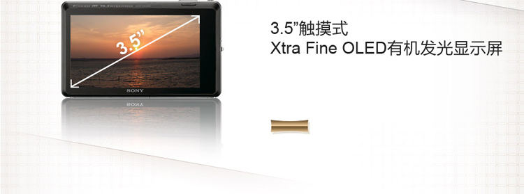 tx100数码相机配备3.5"触摸式xtra fine oled有机发光液晶屏,以真实色彩、强烈对比和高速运动生动地再现生活!与传统液晶屏相比,oled有机发光液晶屏展现的静态图像对比更强、视角更宽,生动且富有震撼力。此外,它的反应速度也比普通液晶屏快,令动态动作回放更加顺畅。现在,快使用dsc-tx100数码相机记录和观看静态或动态影像吧!