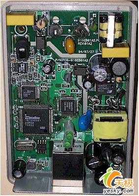 最后,我们就来看看SMC的那款SMCCHT-ETH,乍看之处,你可能会错误地把图9中的那块SMC产品的电路板当成Actiontec公司的那款“HUB”型号产品(图6中所示),它们都使用了那种一体成型的塑料外壳,而唯一不同的是外形尺寸的大小。仔细看一下你可能会发现它的电路板设计实质上与Actiontec公司的那款单端口的产品是一样的,它们之间的不同之处是SMC的这款产品只不过是做成了桌面产品的方式,而Actiontec的HT100是可以直接插在墙壁的电源插座或某个电源插线板上。
