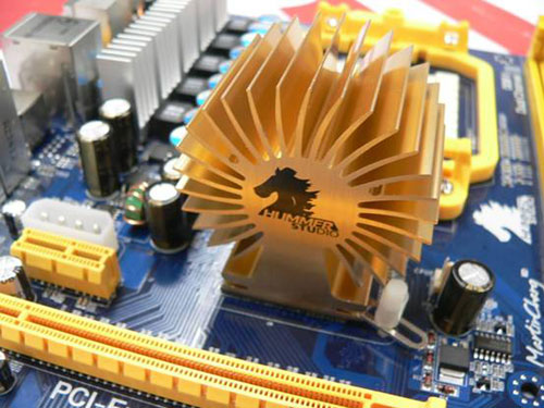 570X芯片组的发热量并不高,采用被动散热即可。这款捷波570X主板采用了立体设计北桥散热芯片,上面印有悍马(HUMMER)的英文LOGO,个性十足!
