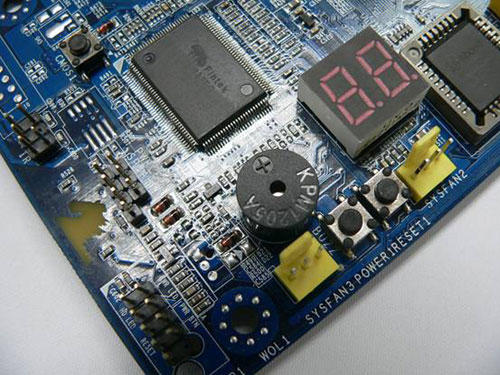 为了方便超频玩家进行裸机测试,捷波悍马570X主板板载蜂鸣报警器、Debug指示灯以及电源启动开关、CMOS清除开关等人性化设计。
