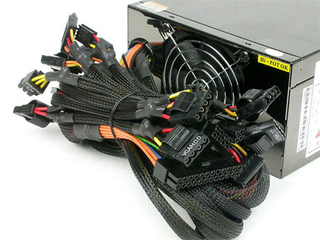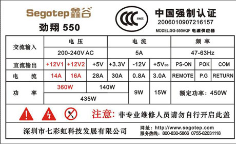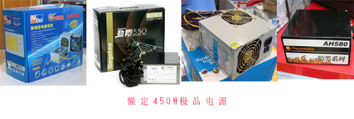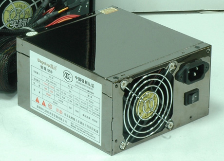 目前市场上的额定450W的电源,康舒450C-A2SNN、鑫谷劲翔550、TT AH-580 (W3011)、台达洪涛660都可谓是额定450W功率的极品电源。 品牌:鑫谷——劲翔550 ATX12V 2.2 额定450W 这是鑫谷2007年杀入高端市场首当其冲的产品——劲翔550!也是一款符合RoHS标准的无铅产品!因为是无铅产品加镜面外壳的高档做工,一眼就可以得知它的造价不菲。外壳采用厚度为0.8mm黑色镜面镀镍材料,外壳绝缘,使用更安全。