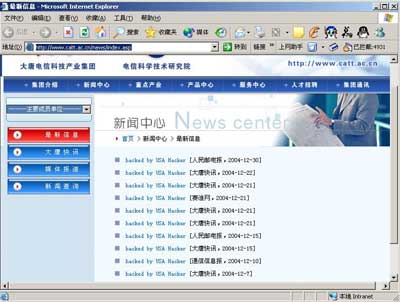 从大唐目前被黑的情况来看,除了主页“特别关注”“最新动态”出现被黑字样,还有新闻中心最新动态也被改为“hacked by USA hacker”,“大唐快讯”栏目内的正文页标题也被篡改成同一字样。不过,首页导航条内的“重点行业”“产品中心” “服务中心”“人才招聘”“集团通讯”等栏目都可以正常显示。这表明目前只有部分的web服务器被攻克。