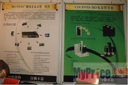 位于展位左侧是DVD广播级光盘录像一体机和蓝光播放机,这是为众多的专业视频用户和广电行业部门量身打造的一款产品。与现有的录像机相比,它有着更清晰的质量和人性化的设置,独有的自动检测功能即无信号和信号源中断时暂停刻录,恢复正常后自动继续刻录,可以让您即使在无人职守的情况下依然安心录制。外置高频头,方便的电视接收功能,可预约定时录制。另外,其丰富的视频接口和极高的性价比相信更能让您的眼前一亮。