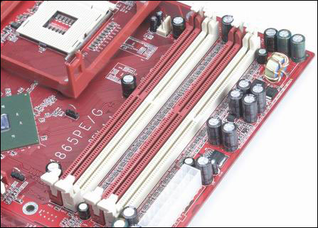 采用三相供电,电容排列整齐。四条DIMM插槽支持双通道DDR400,红白分隔的做法有利使用者正确是使用双通道。